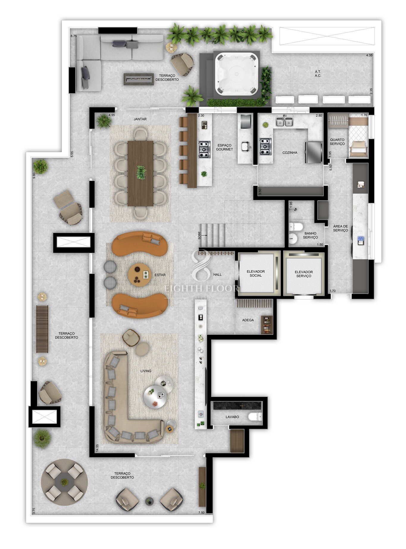 Amplo terraço descoberto com estar e jacuzzi